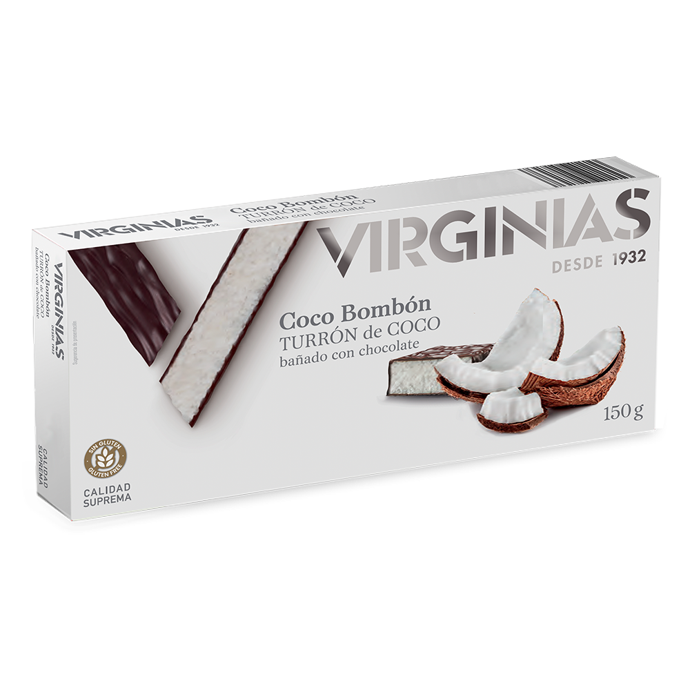 Turrón de coco recubierto con una fina capa de chocolate negro. Una combinación que une la suavidad del coco con el sabor intenso del chocolate, creando una experiencia única elaborada con ingredientes de calidad.