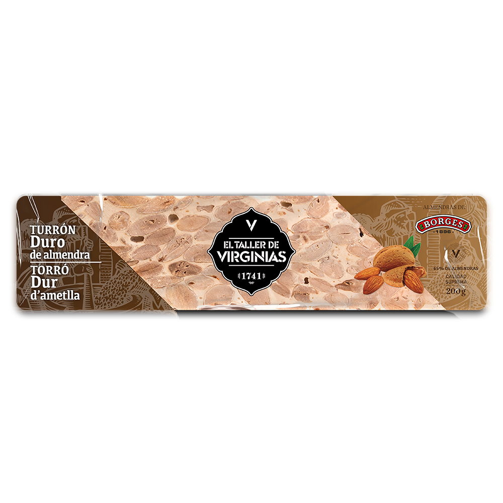 Con un 65% de almendras Borges seleccionadas, esta versión del turrón duro ofrece más sabor y una experiencia más intensa. Una receta clásica que refleja la autenticidad y el saber hacer de El Taller de Virginias, elaborada con ingredientes de calidad.
